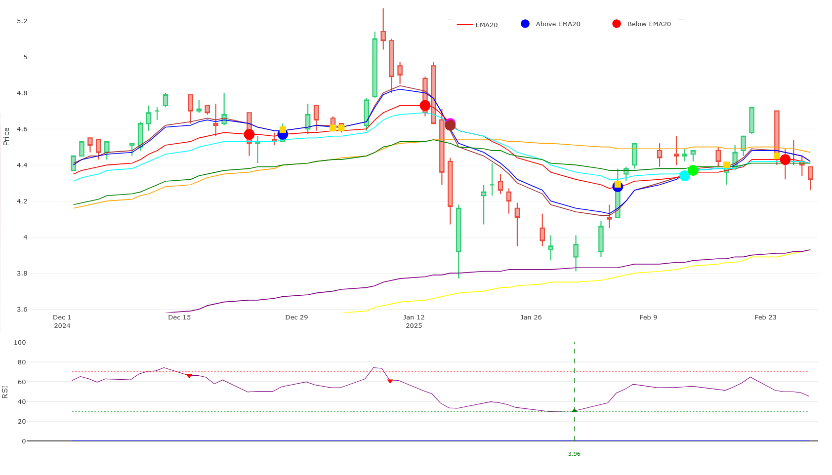 • By May 2, 2025, the price is far above the EMA20 (Close: 4.360 vs. EMA20: 3.992).